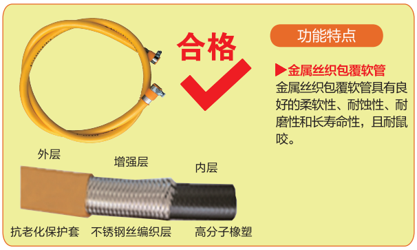 此外,家用燃气灶具自购买使用之日起,满八年应及时更换;燃气用具连接用金属包覆软管需选用合规产品并定期检查;带过流保护切断功能的调压器必须合格并规范安装。