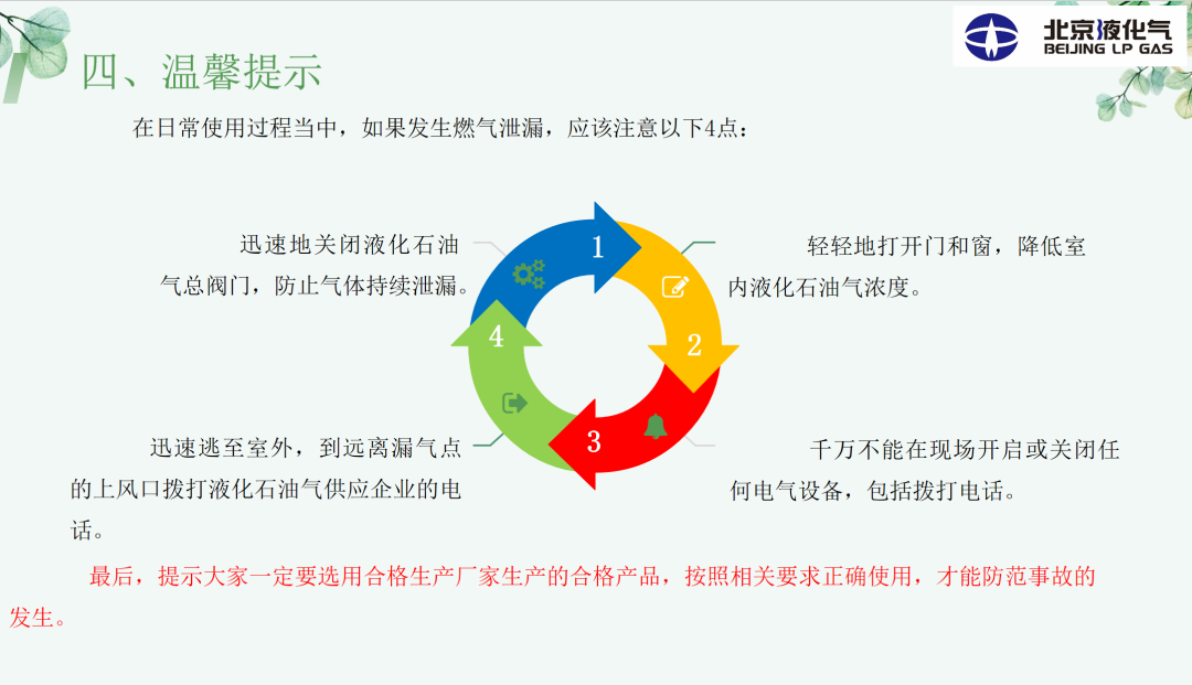 • 一旦发生液化气泄漏,要迅速关闭液化石油气角阀(手轮),轻轻打开门窗,迅速逃至室外,到远离漏气点的上风口拨打北京市液化石油气有限公司24小时服务热线96157。